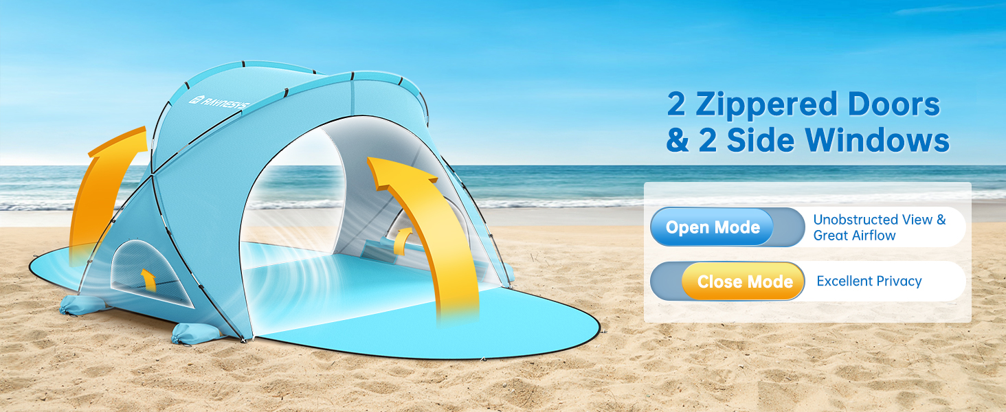 The tent doors can be zipped down and put down to serve as an expandable floor for beach parties. And when you need privacy, simply zip them up and then you can get a safe private space.