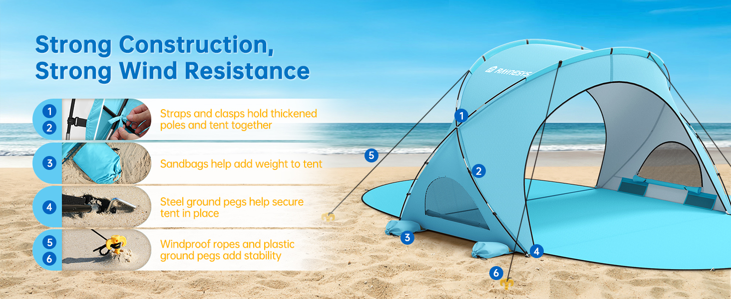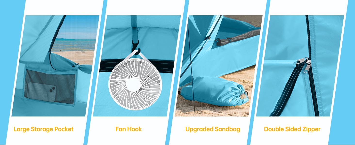 This beach shelter adopts 8.5mm fiberglass poles for support, which is sturdy and not easy to break. And our tent comes with sufficient windproof accessories to improve the stability. Even in windy weather, it can stand steadily.