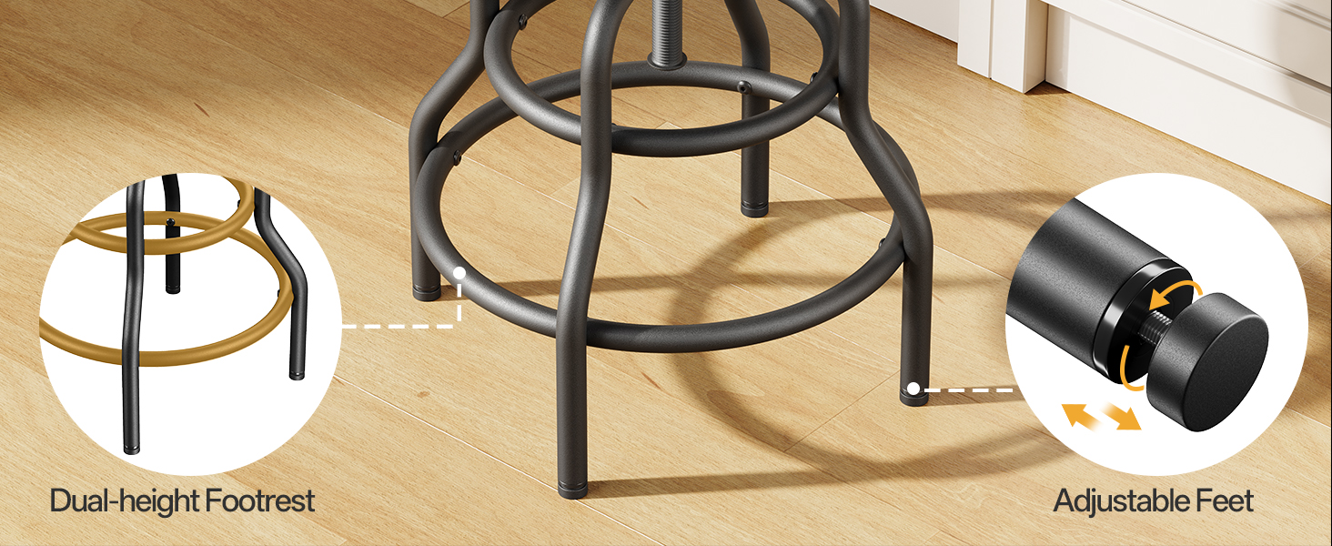 • Adjustable Feet: Leveling feet can be used on uneven ground to maintain balance and keep the modern bar stools stable when used.