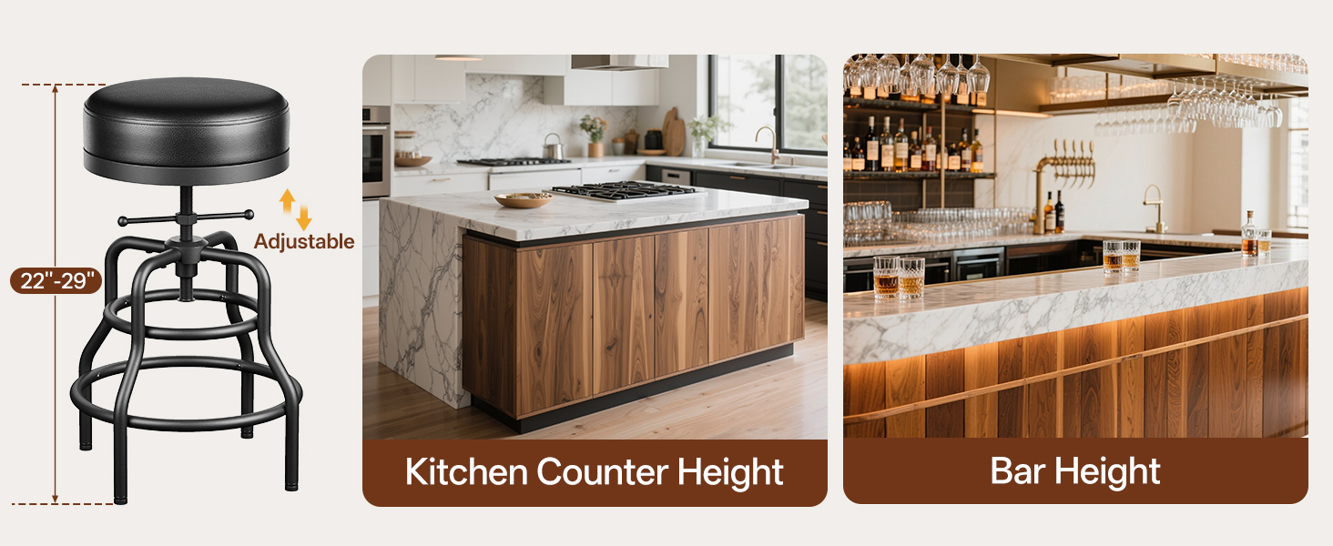 • Adjustable Height: Adjust the seat heights from 22 inch to 29 inch to satisfy different heights and counter heights.