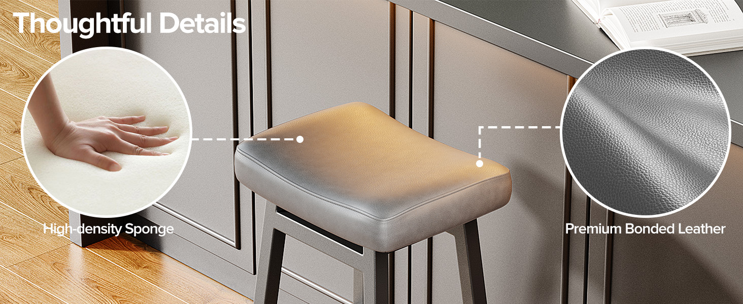 - High Quality Bonded Leather: Premium bonded leather seat cushion is soft and easy to clean, the counter stools set of 2 can be wiped off with a damp cloth.