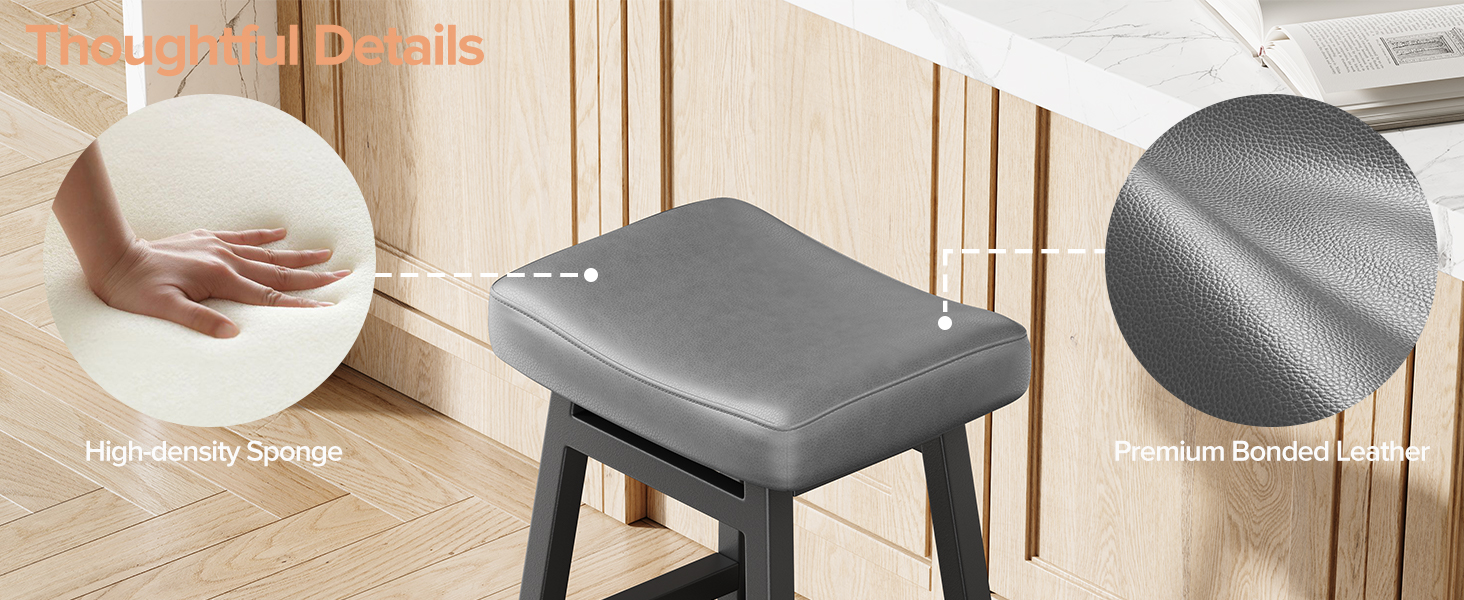 - High Quality Bonded Leather: Premium bonded leather seat cushion is soft and easy to clean, the counter stools can be wiped off with a damp cloth.